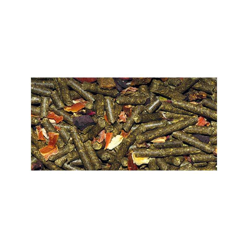 Obsahuje kvalitné sušené prírodné zelené krmivo, vybrané kvety ibišteka, žihľavu, ovocie a zeleninu.